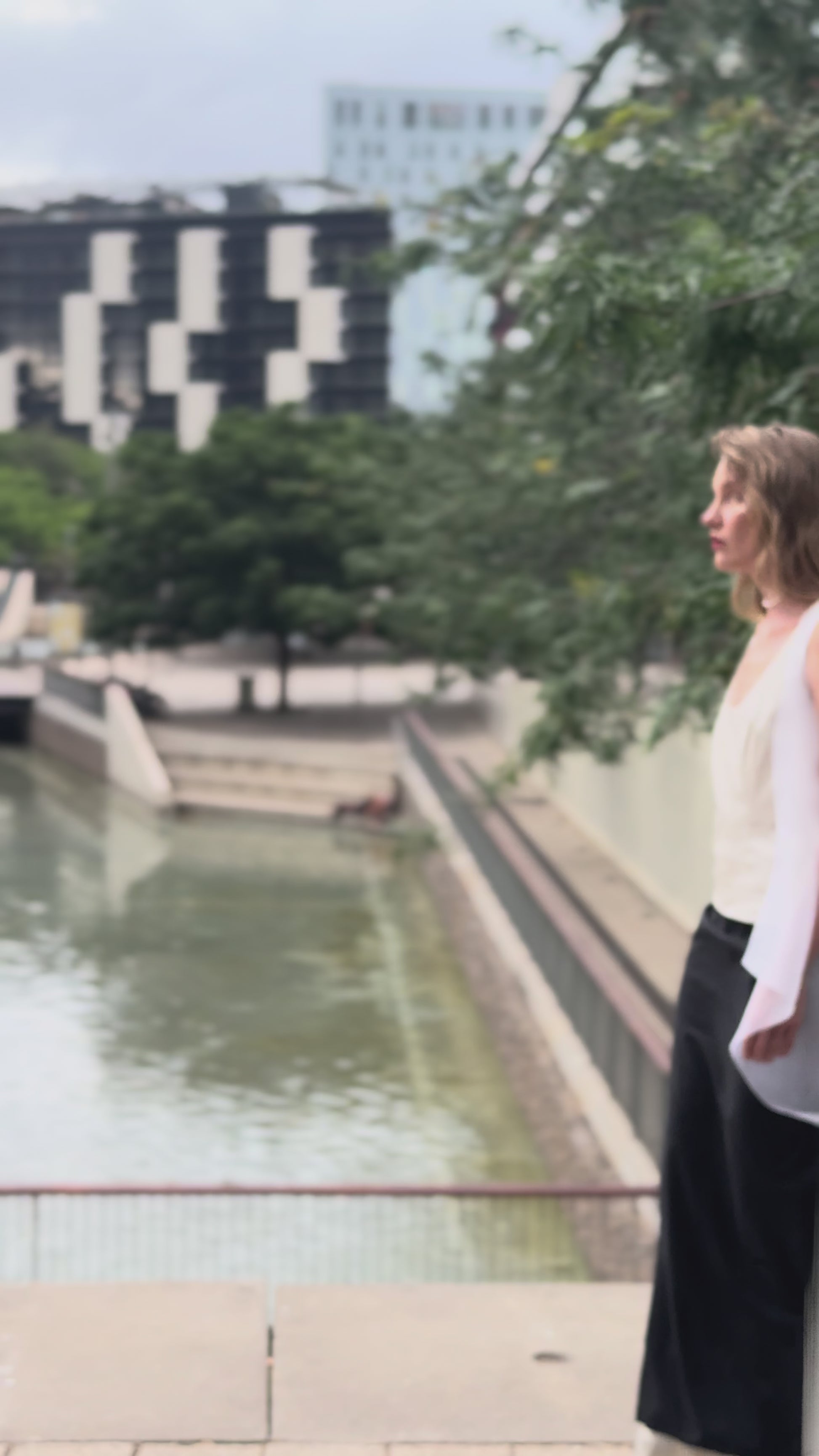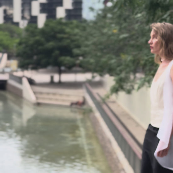 Sleeveless women’s blouse in cotton with a deep scoop neckline and a fitted waist. Asymmetric sheer organza panel drapes from the shoulder; raw-edge finish. Hip length with a concealed back zip. Works as a beige cotton top for tailored skirts or trousers.