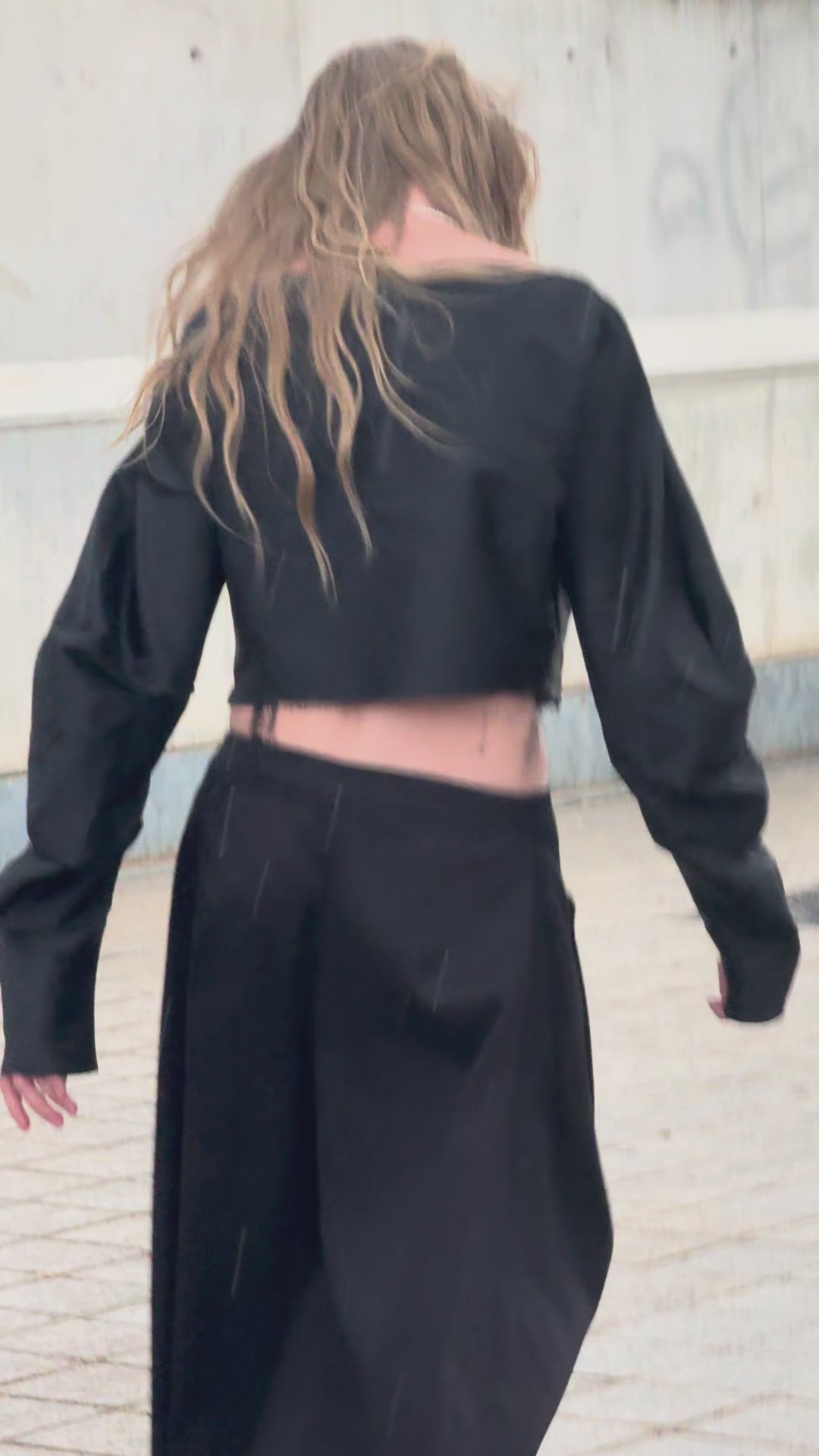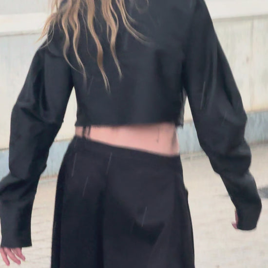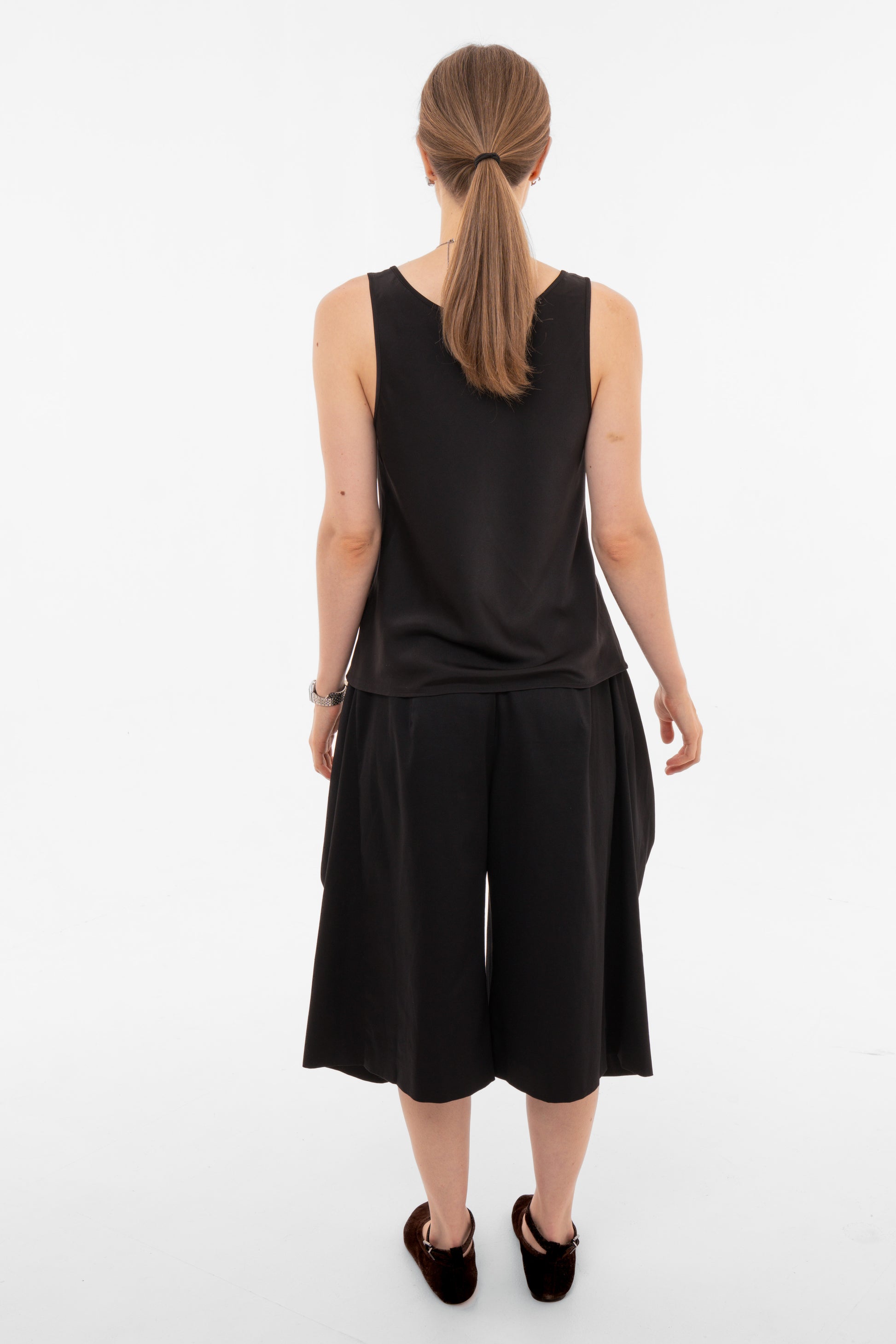Deep Draped Pockets. Unisex below-knee culotte shorts in woven fabric with a subtle sheen. High waist with a concealed front zip. Oversized, deep pockets create a sculpted drape and a geometric leg shape.