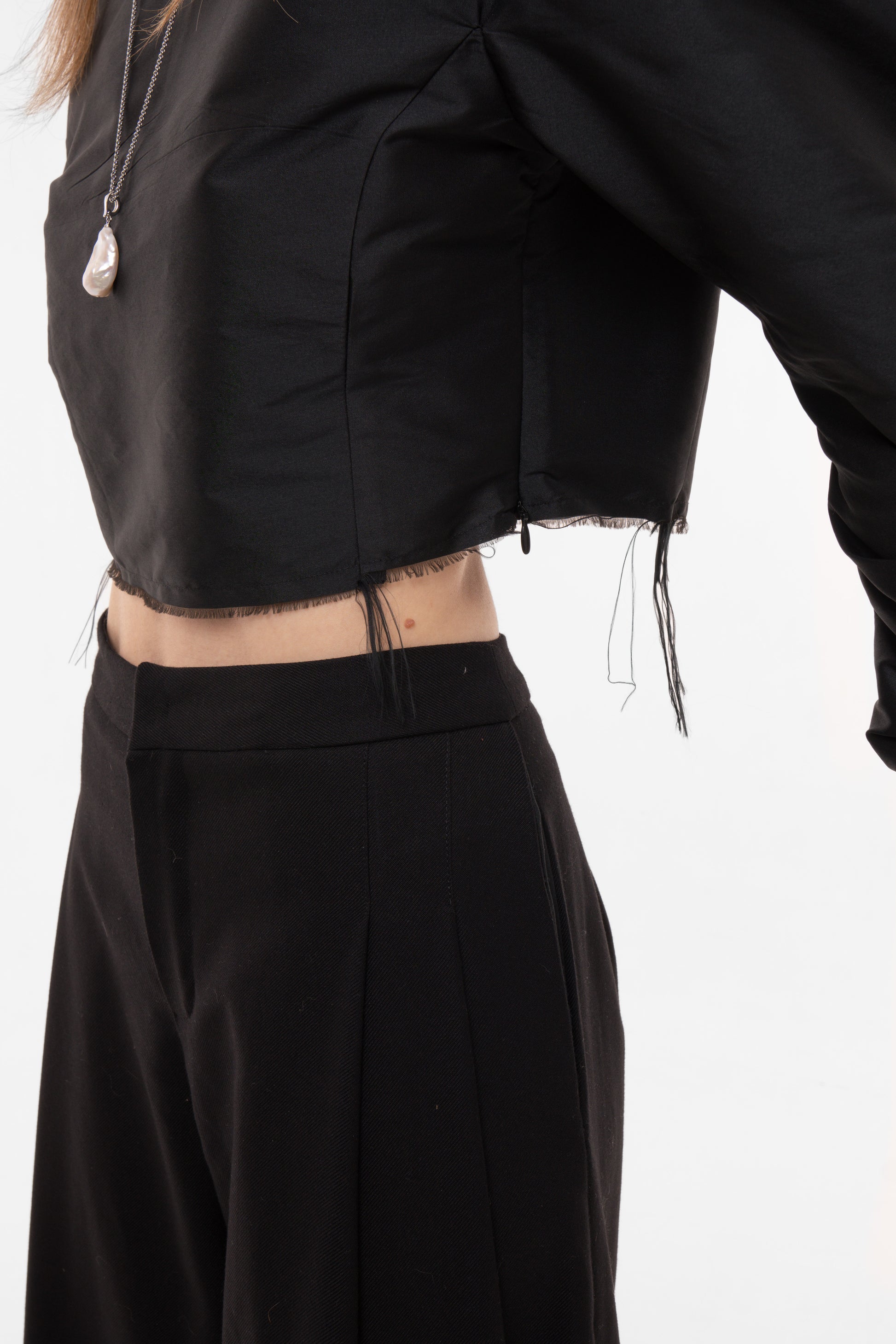 Black Silk Taffeta Cropped Top with Voluminous Sleeves