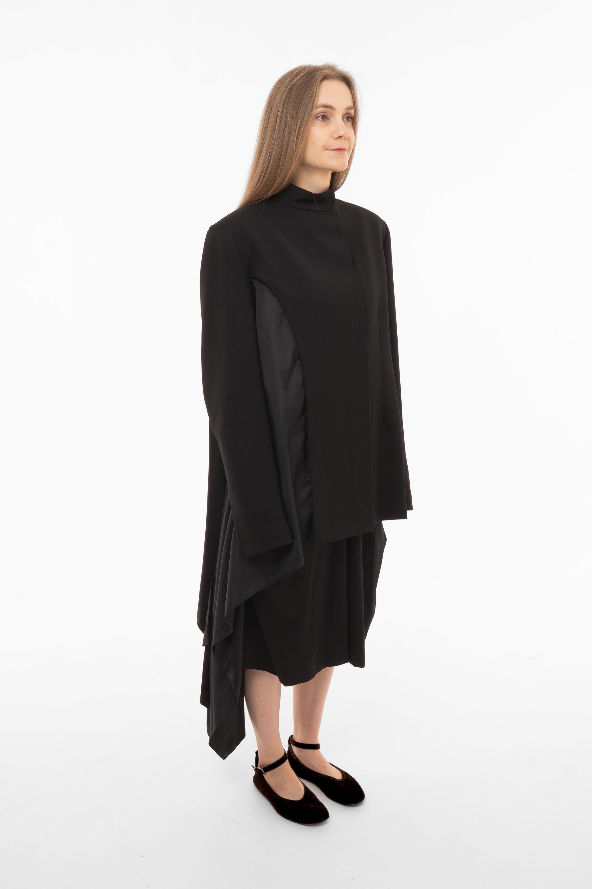 Hidden Placket, Cutout Panels, Asymmetric Draped Lining. Tailored black blazer in lightweight suiting with a band/stand collar and concealed button placket. Curved cutouts on the front and back reveal a long satin lining that drapes below the knee on one side. Structured shoulders, long sleeves, hip length body.