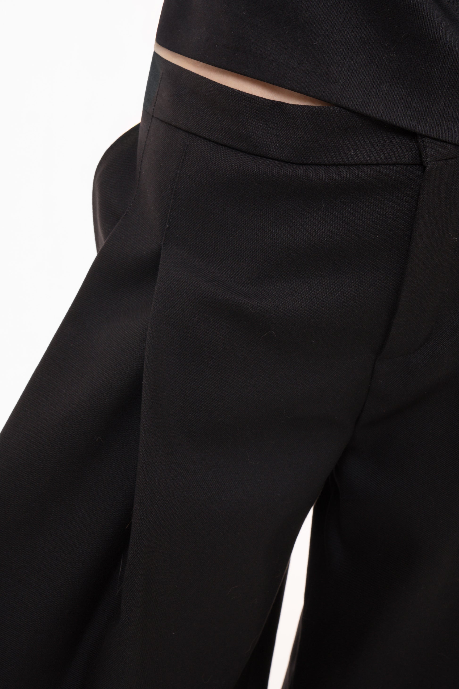 High-waisted palazzo trousers with deep front pleats and wide, fluid legs. No lining, zip closure at the front. Made from structured, heavyweight fabric with soft drape.